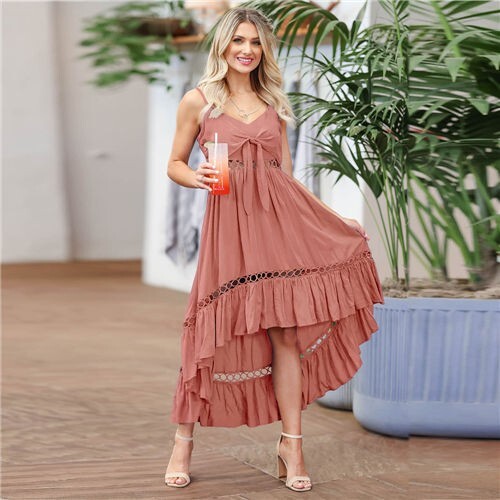 Float through the season in our Blush Cascade Lace Maxi Dress, where modern romance meets carefree elegance. This high-low hemline design features delicate spaghetti straps, tiered ruffles, and playful lace paneling for that perfect balance of structure and movement. The back bow-tie detail adds an extra hint of charm, making this a stunning choice for beach days, date nights, or warm-weather celebrations.