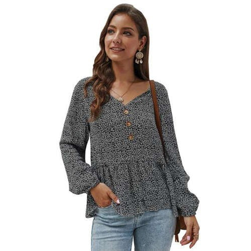 Small Flowers Pattern V-neck Long Sleeves Women Blouse - Black