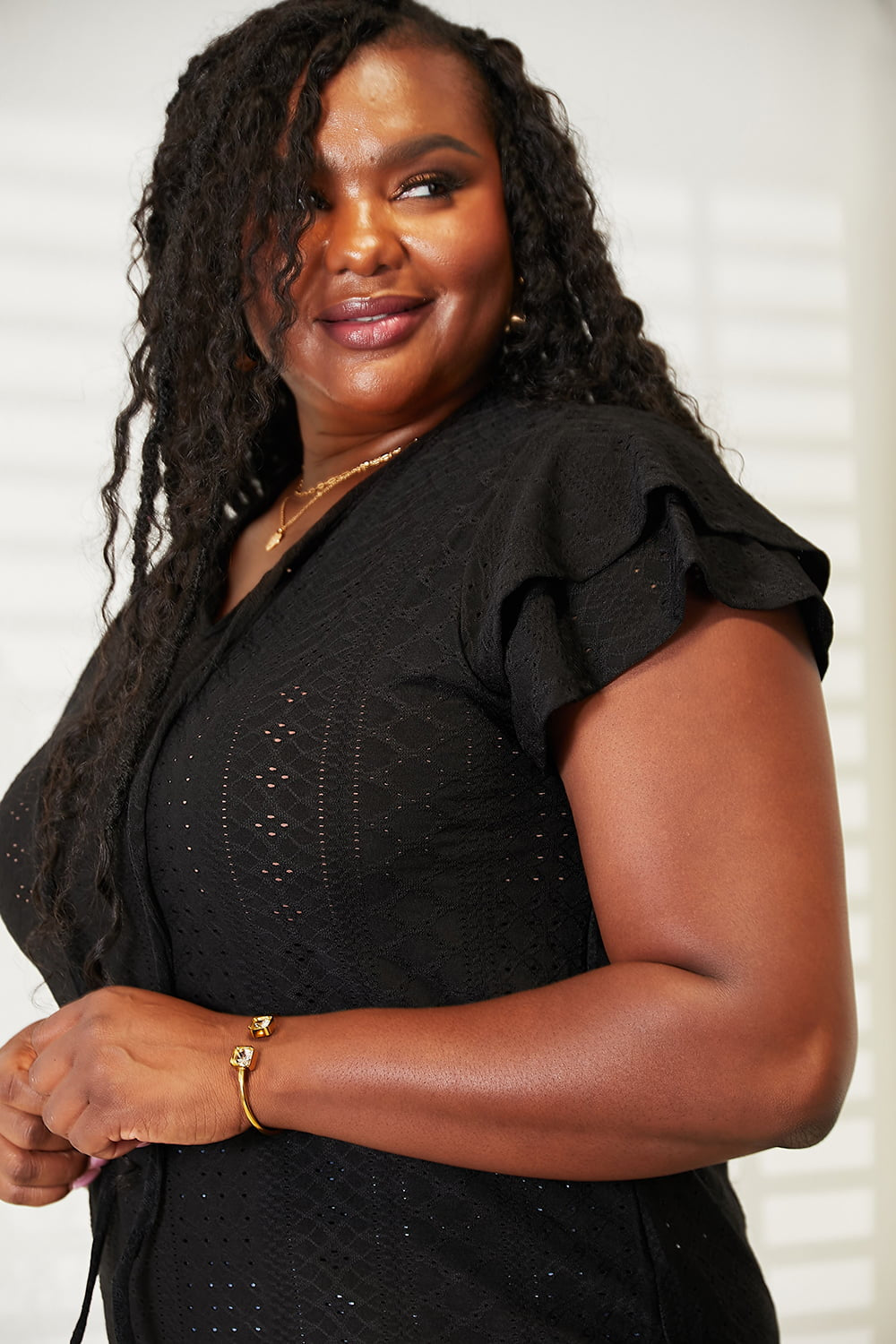 Elevate your style with this stunning Eyelet Tie-Neck Flutter Sleeve Blouse. The intricate eyelet design and flutter sleeves give a feminine and whimsical touch, while the tie-neck adds a touch of elegance and sophistication.
