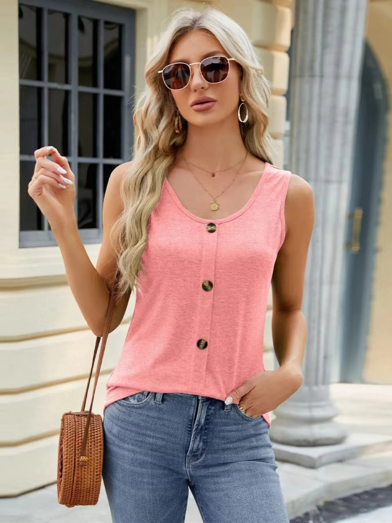 Stay cool and chic all summer with this Scoop Neck Casual Tank Top. Designed in a slightly stretchy blend of rayon, polyester, and spandex, it hugs comfortably while letting you move freely. Features a decorative button detail and classic scoop neckline for versatile style. Pair it with denim, skirts, or under jackets for layering—this tank is ready for a range of everyday looks.